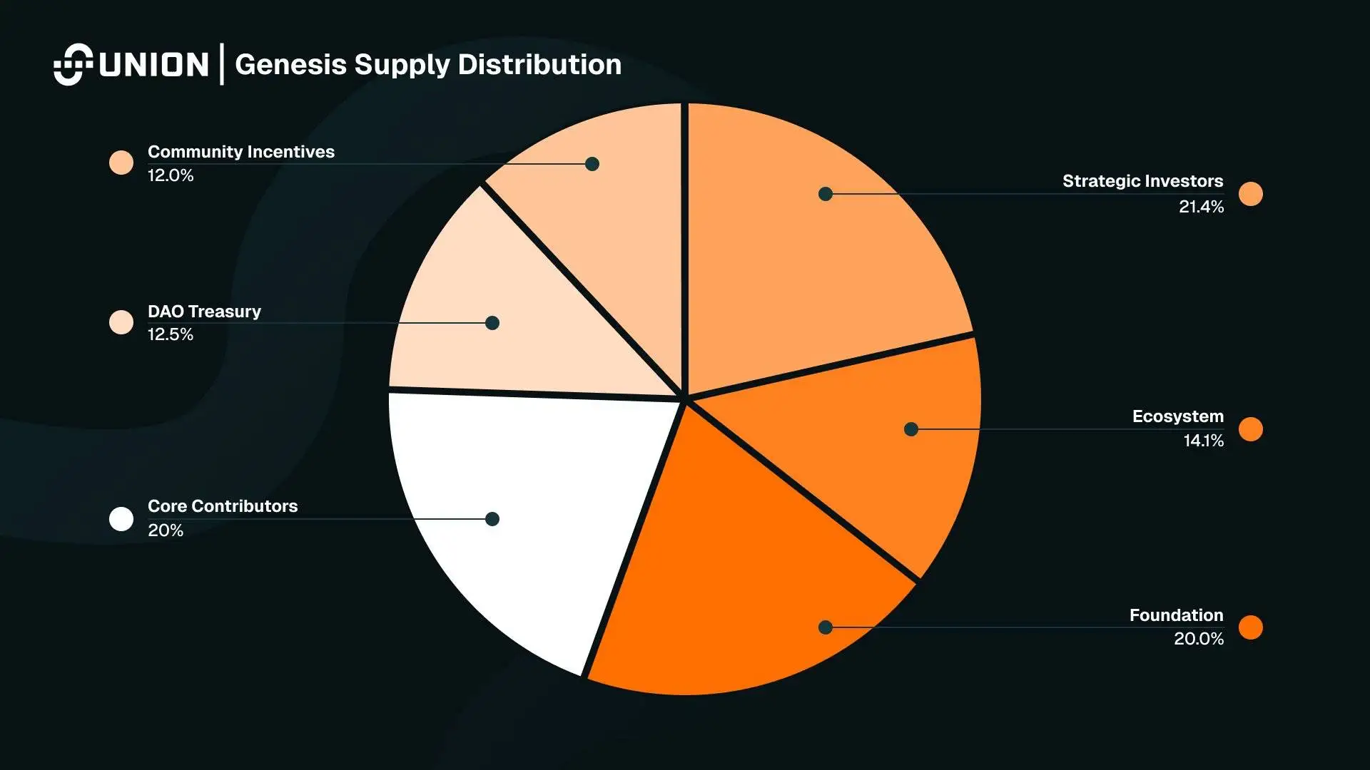 Union协议于8月26日披露U代币经济学模型,U代币初始总发行量设定为100亿枚,其中19.19%(1,919,050,000枚)作为初始流通量。代币分配结构显示:战略投资者占比21.4%;生态系统14.1%;基金会20%;社区激励12%;DAO财库12.5%;核心贡献者20%。
