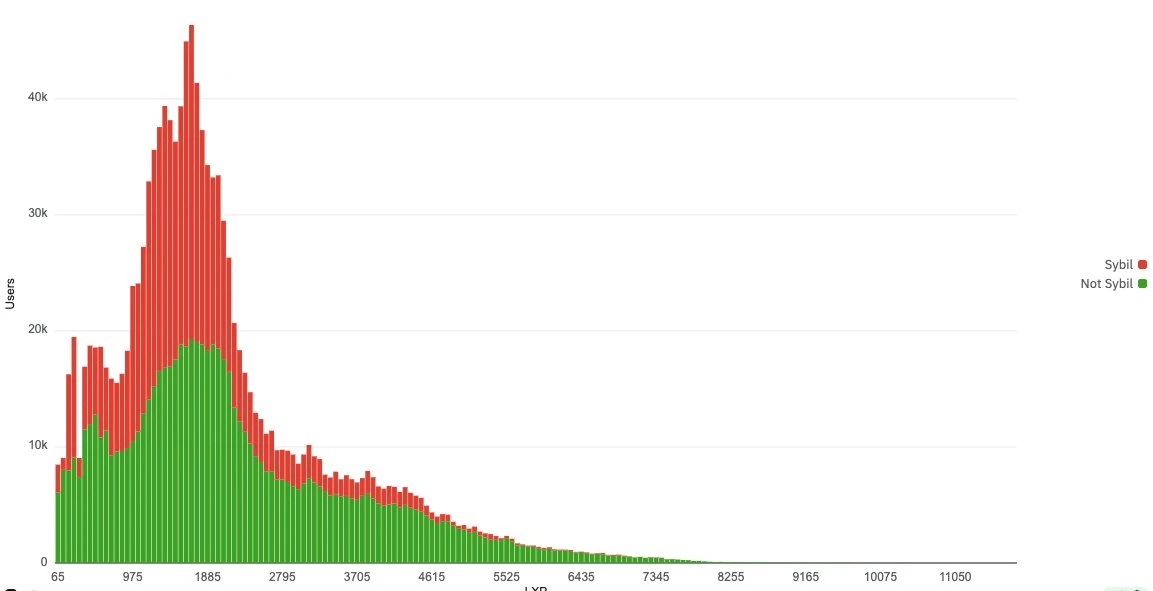Nansen监测数据显示,Linea LXP激励计划存在大规模女巫攻击行为。分析表明,在1000-2000积分的核心分布区间内,被标记为Sybil账户的红色标识区域显著超过正常用户绿色标识区域。