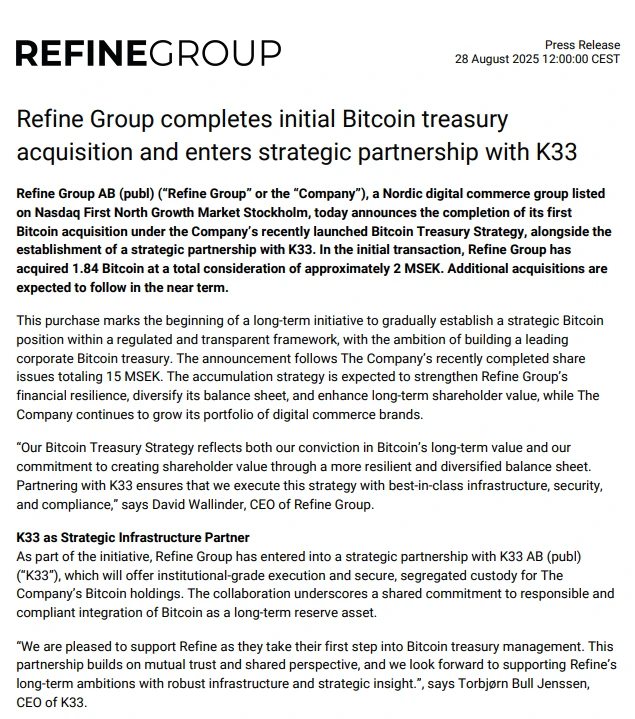 瑞典上市公司Refine Group AB于8月28日启动比特币储备计划,首次购入1.84枚比特币,并与加密货币研究机构K33建立合作关系。