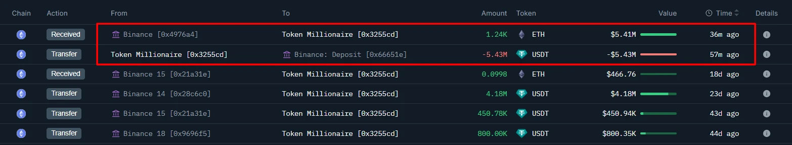 某鲸鱼地址向币安交易所转入5,054.5枚ETH,价值约2,360万美元