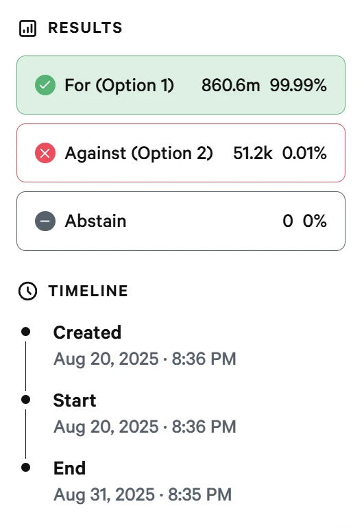 Snapshot页面信息显示,Sonic Labs'美国市场扩张及传统金融采纳'治理提案于9月1日以99.99%支持率通过。该提案核准三项核心资金用途:发行代币募集5000万美元ETF配额,1亿美元用于纳斯达克PIPE开发,1.5亿S代币定向投放Sonic USA。治理方案同步更新代币燃烧机制:FeeM交易收益分配中90%归属建设者、5%分配验证者、5%强制销毁;非FeeM交易则执行50%销毁与50%验证者分配机制。根据规划,Sonic USA将设立首席执行官职位,并在纽约设立实体办公室,重点推进机构投资者采用及监管合规建设。