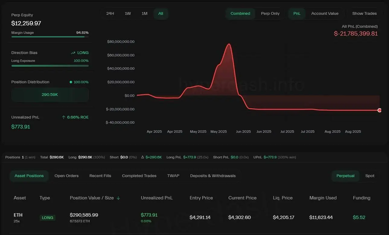 交易员James Wynn于9月2日重新入场,建立25倍杠杆的以太坊(ETH)多头仓位。