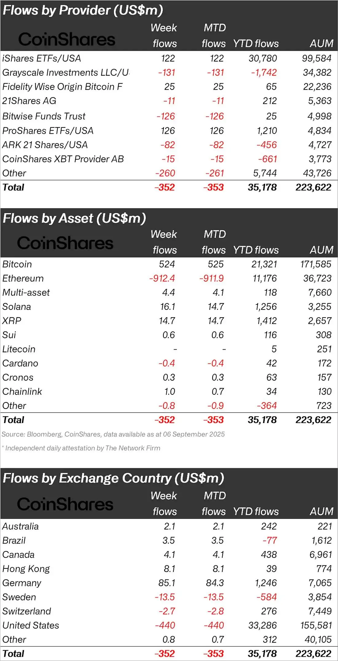 CoinShares最新周报显示,9月8日当周数字资产投资产品遭遇3.52亿美元净流出,交易量环比下降27%。细分数据显示,比特币当周录得5.24亿美元净流入,以太坊则出现9.12亿美元净流出。Solana与XRP分别获得1470万美元资金流入。地区分布方面,美国市场资金流出达4.4亿美元,德国及香港地区则分别吸引8,510万美元和810万美元净流入。