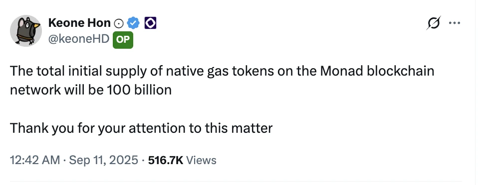 Monad链上原生Gas代币初始供应量公布,联合创始人Keone Hon确认为1000亿枚