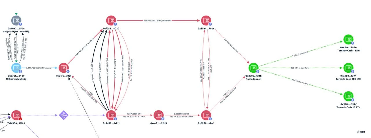 链上安全专家ZachXBT于9月11日发布报告称,以太坊网络一名匿名用户于前日遭遇黑客攻击,导致304.7万枚USDC稳定币被盗。攻击者随后将盗取的USDC全部兑换为以太坊(ETH),并通过混币协议Tornado Cash立即执行洗钱操作。涉案攻击地址为0xf0a6c5b65a81f0e8ddb2d14e2edcf7d10c928020