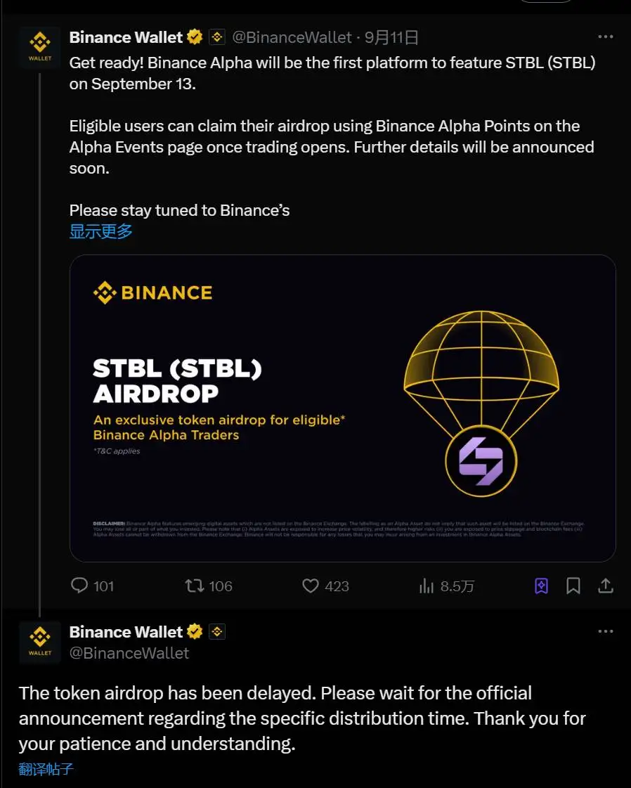 币安Alpha平台STBL代币空投活动推迟公告