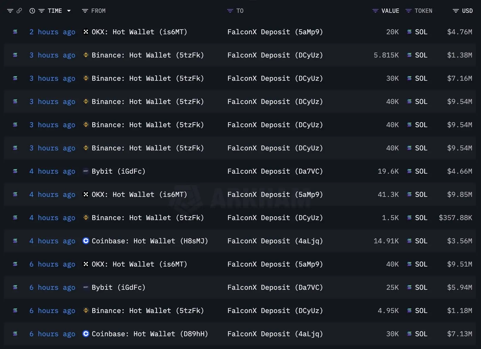 9月17日,链上分析平台Lookonchain监测显示,机构FalconX在过去8小时内自币安、OKX、Coinbase及Bybit等交易所累计提取413,075枚SOL,对应价值约9840万美元。