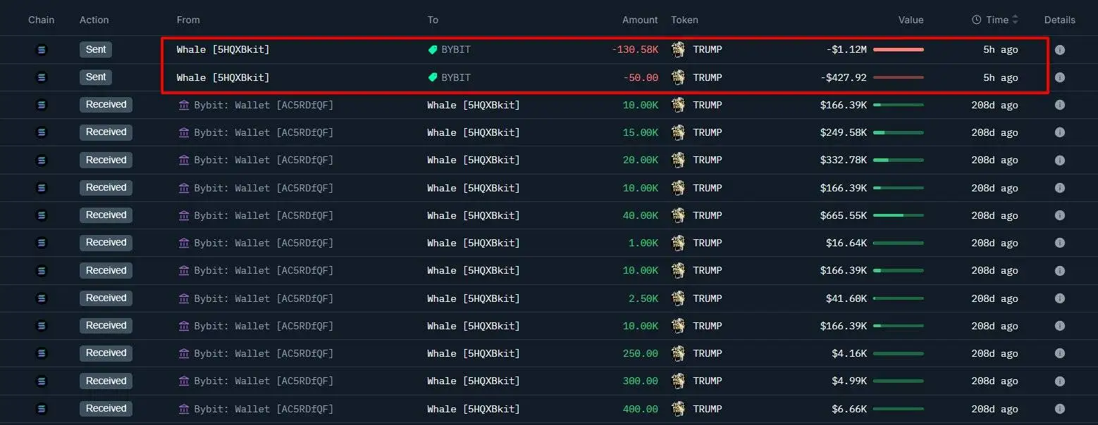 某鲸鱼将13万枚TRUMP代币存入Bybit,亏损近百万美元