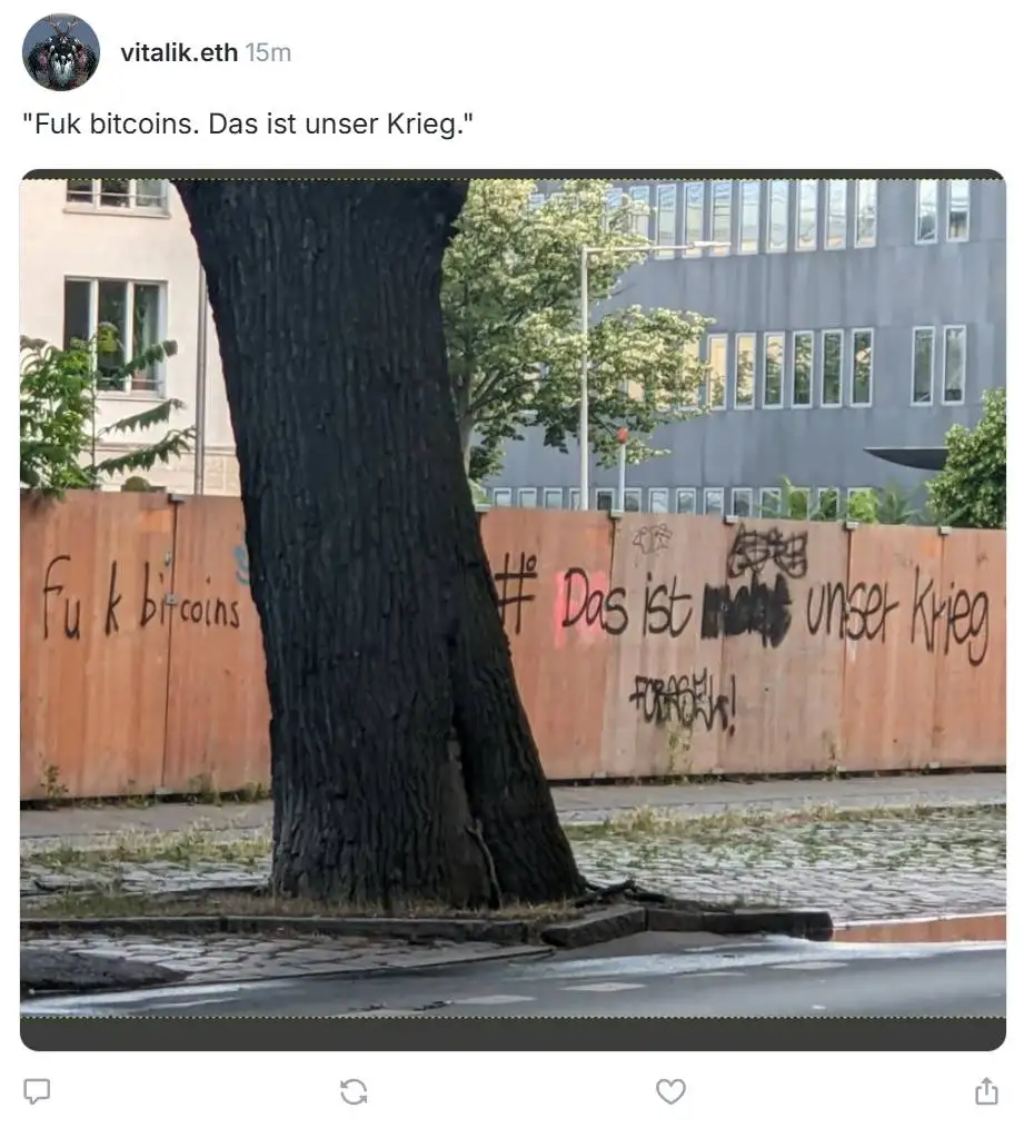 6月27日,以太坊联合创始人 Vitalik Buterin 在社交媒体发布一张涂鸦墙照片。该涂鸦内容为德语短句 “Fuk bitcoins. Das ist unser Krieg”,直译为”去他的比特币。这是我们的战争”。
