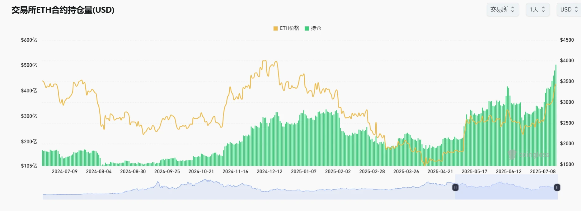 7月17日,根据Coinglass平台监测数据,以太全网合约持仓量首次突破500亿美元门槛。当前数值达到503.05亿美元,较前日增长8.06%,该指标已刷新历史最高纪录。