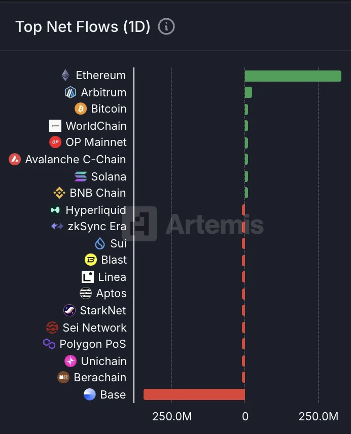 6月27日,Artemis数据显示,以太坊当日净流入3.32亿美元,Arbitrum净流入2680万美元;Base净流出3.45亿美元,Berachain净流出720万美元。