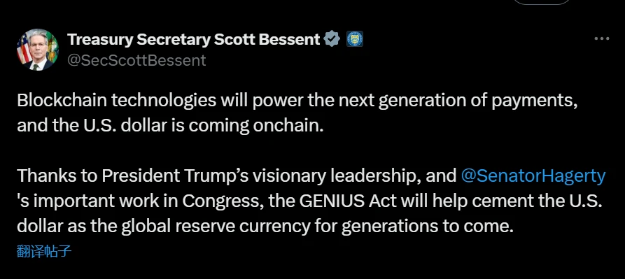 7月20日,美国财政部长贝森特在社交媒体平台X发布声明称,区块链技术将为下一代支付系统提供动力。美元即将通过区块链技术实现链上流通,这一发展得益于特朗普政府的领导及参议员Bill Hagerty在国会的推动。《GENIUS法案》将为美元在全球储备货币体系中的地位提供制度保障。