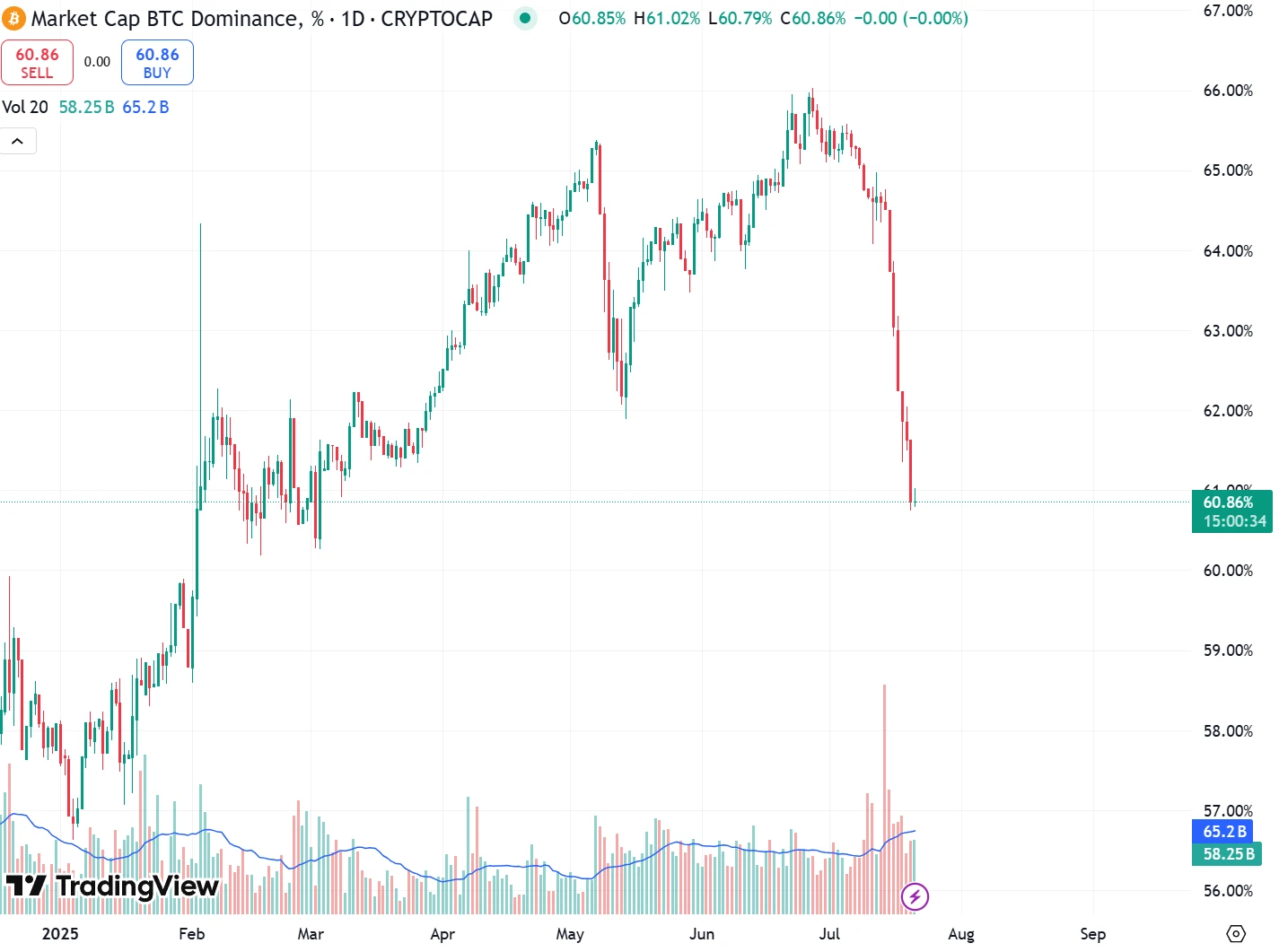 比特币市占率跌至60.86% 创四个月新低 山寨币季节指数周涨幅达78%