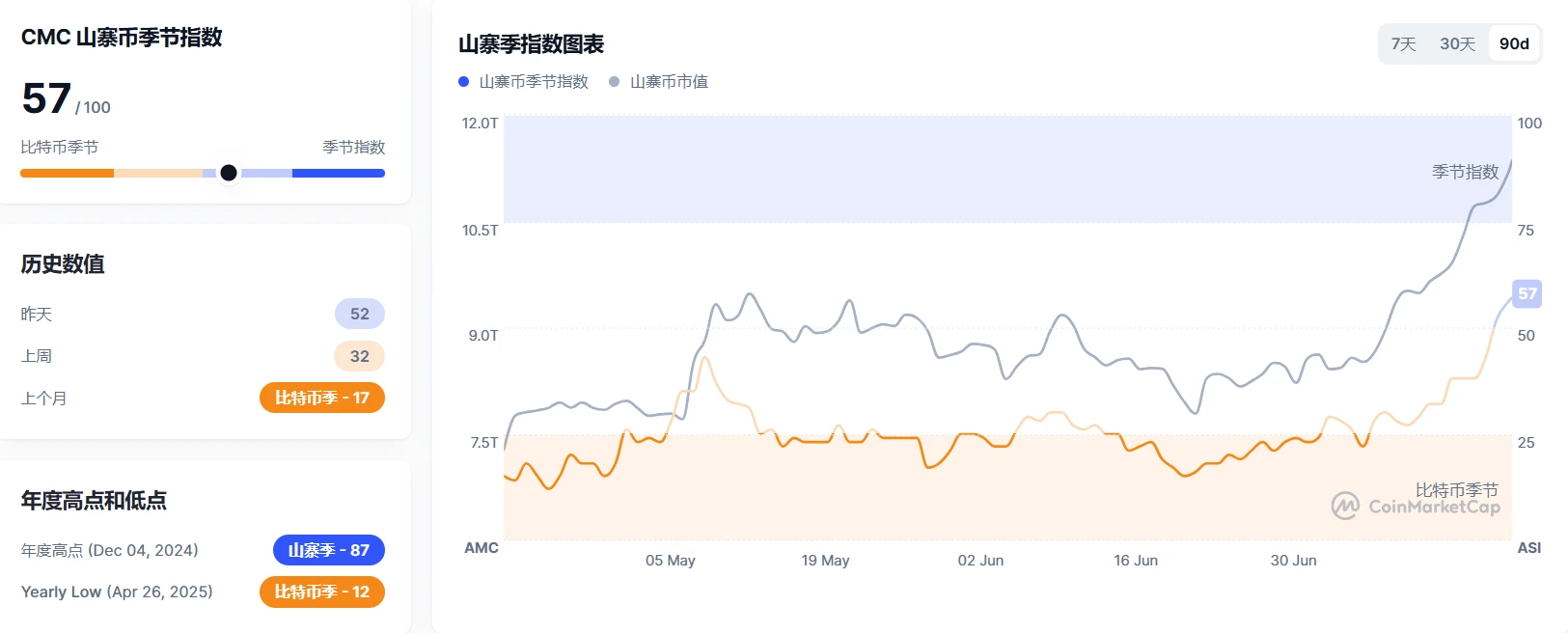 7月21日,TradingView数据显示比特币市占率持续下降至60.86%,为今年3月3日后最低水平。CoinMarketCap山寨币季节指数当前为57,较上周均值上升25点,涨幅达78%。该指数表明,在过去90天内,市值前100加密货币中有57个项目的涨幅超过比特币。该指数通过对比市值前100山寨币过去90天的表现来判断市场是否处于山寨币主导期。
