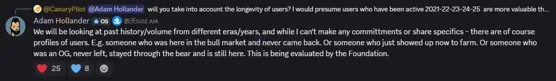 OpenSea团队成员Adam Hollander于7月30日通过Discord回应社区关于代币空投标准的提问,确认团队正基于用户历史使用数据及交易量进行评估,但未透露具体细节。其提及的用户画像考量包括:曾参与牛市后流失用户、近期为挖矿新注册用户,以及自平台早期持续留存至今的OG用户群体。