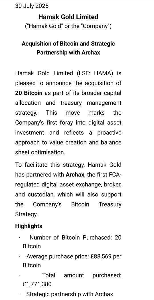 英国上市公司Hamak Gold Limited于7月30日完成首笔20枚BTC购入,该信息来源于官方公告。