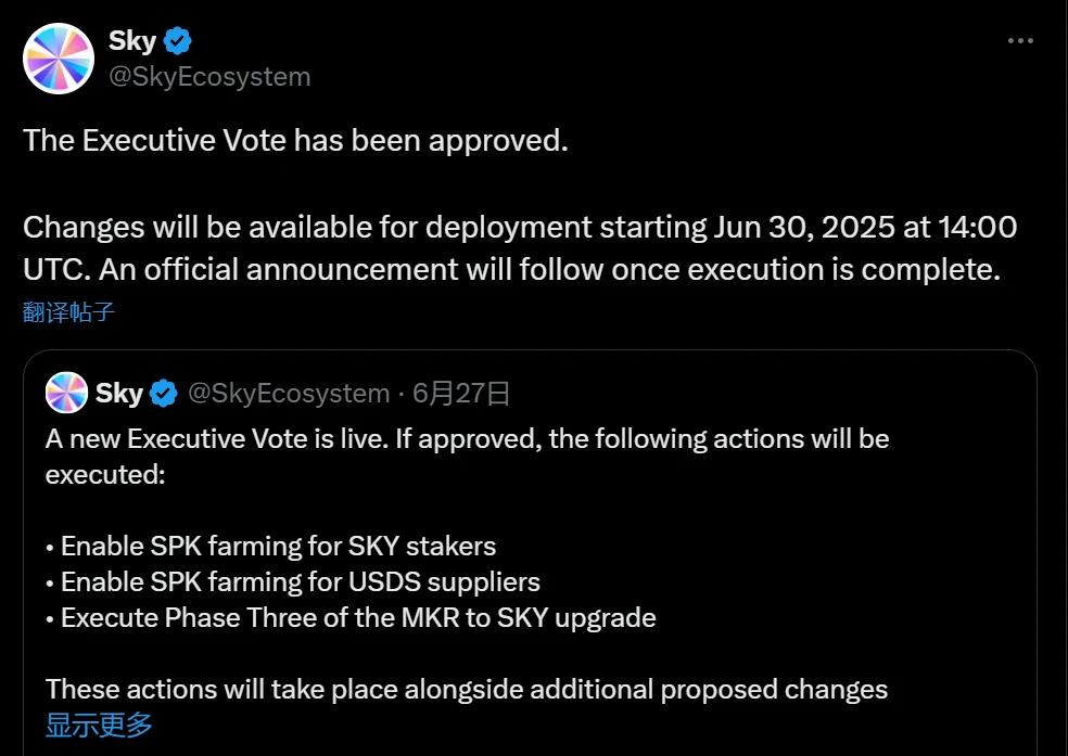6 月 30 日,官方公告显示 Sky 协议新执行方案已通过社区表决。系统将于 2025 年 6 月 30 日 22:00 开始部署升级,具体功能包括:开放 SKY 代币质押者的 SPK 挖矿权限、启用 USDS 稳定币供应商的 SPK 挖矿机制、启动 MKR 至 SKY 代币升级的第三阶段流程。官方将在升级完成后发布正式运行公告。