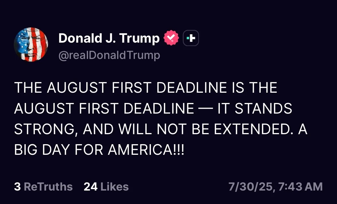 特朗普7月30日通过Truth Social平台确认,(关税)8月1日的最后期限维持原定安排,无延期计划。