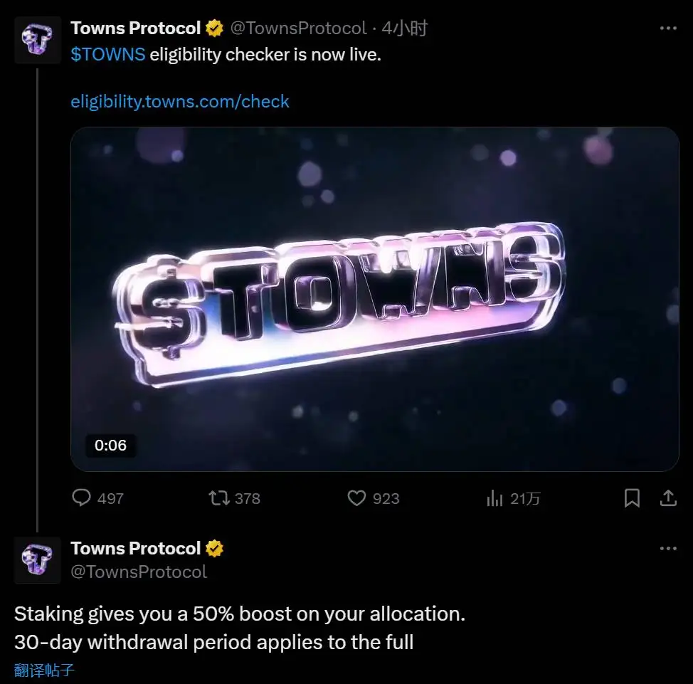 社交通信协议Towns Protocol通过官方公告宣布,其空投资格检查工具于8月5日正式上线。