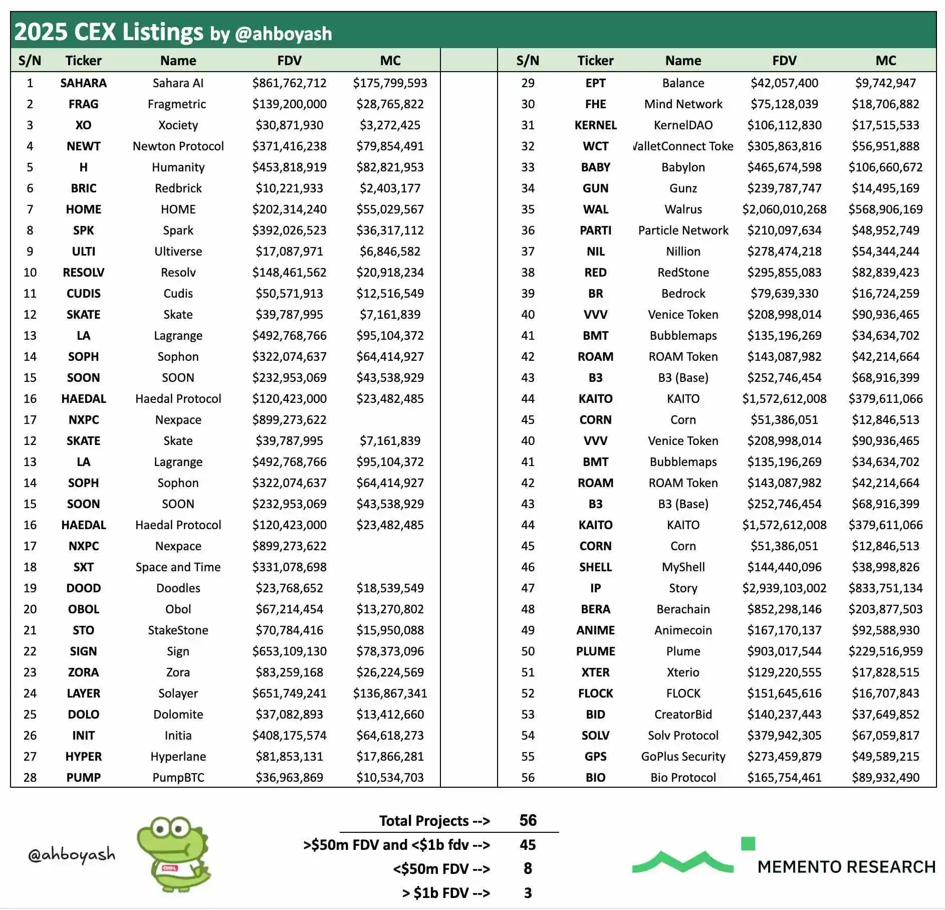 2025年7月2日,X平台用户@ahboyash发布的数据显示,2025年上半年共有56种获得风险投资支持的代币完成代币生成事件(TGE)并进入交易市场。其中80%(45个项目)的代币在发行时总完全稀释估值(FDV)处于5000万至10亿美元区间,8个项目的FDV低于5000万美元,仅有KaitoAI、StoryProtocol和WalrusProtocol三个项目FDV突破10亿美元。