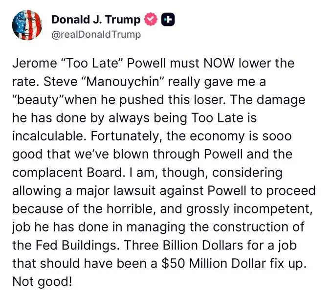特朗普于8月12日通过社交媒体公开批评美联储主席鲍威尔,指责其降息决策滞后且管理美联储大楼建设项目严重失职,导致实际支出达30亿美元,远超原定5000万美元修复预算。该言论同时提及可能对鲍威尔发起重大诉讼,但未提及具体法律依据。
