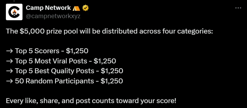 Camp Network与Rova平台联合发起Camp Bullpost内容创作活动,活动周期为8月11日至18日。总奖金池达5,000美元,具体分配方案为:前5名得分者、前5个最具传播力帖子、前5个最优质帖子各获1,250美元,剩余1,250美元将随机奖励50名参与者。参赛者需通过rova.xyz平台发布Camp Network相关内容,系统将根据发帖量、点赞数及分享量计算最终得分。