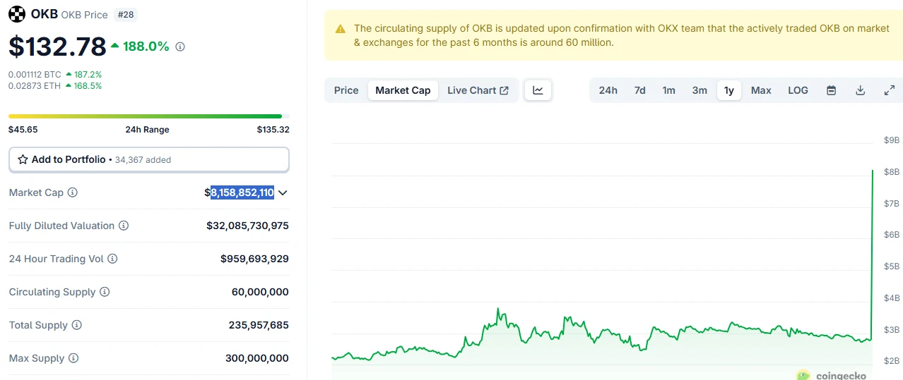 OKB市值突破80亿美元,24小时涨幅达188%跃居加密货币第28位