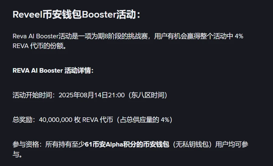 币安钱包将于8月13日启动Reveel(REVA)Pre-TGE和Booster双活动。Pre-TGE活动允许符合条件的用户在REVA正式上线交易前优先参与认购。Booster活动则要求用户通过完成阶段性任务并支持项目早期发展,可参与瓜分4千万REVA空投奖励。