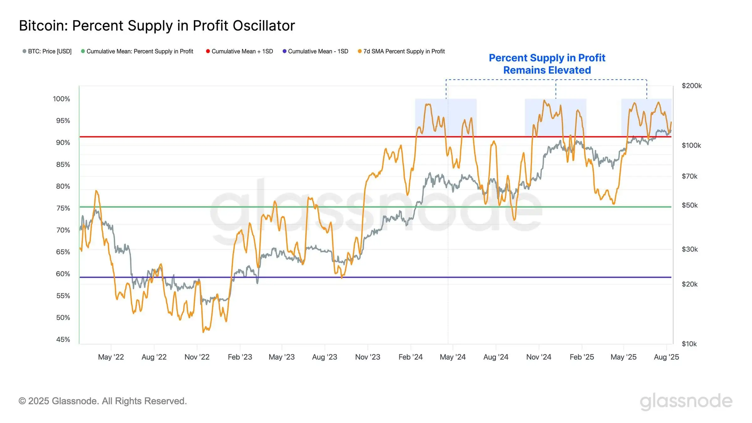 Glassnode于8月14日通过社交媒体披露,当前99%的比特币供应量处于盈利状态。即便在7月市场调整阶段,该比例仍维持在95%的高位。数据显示,该指标在+1标准差区间获得支撑,表明投资者持续锚定未实现收益,市场结构在波动中展现出韧性。