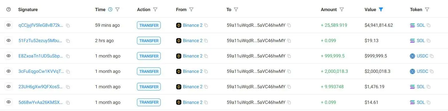 某鲸鱼地址从币安转出25,600枚SOL,价值约494万美元