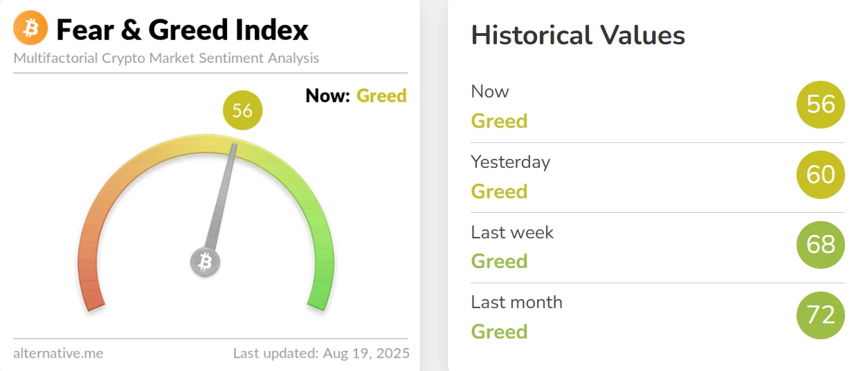 Alternative.me数据显示,8月19日加密货币恐慌与贪婪指数下降至56,较前一日的60下降4点,反映市场持续贪婪情绪。