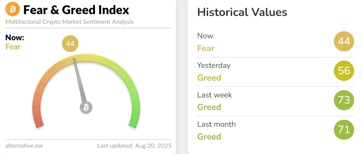 Alternative.me数据显示,8月20日加密货币恐慌与贪婪指数下降至44,较前一日的56下降12点,标志着市场情绪进入恐慌区间。