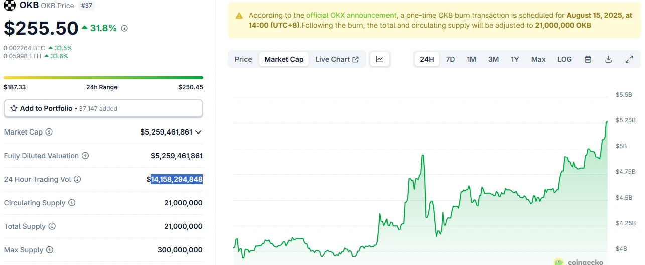 OKB价格突破250美元创新高 市值跃居加密货币第37位