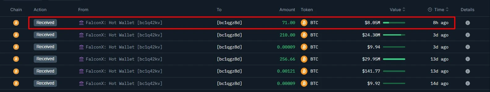 某巨鲸地址从FalconX接收71枚比特币,两周增持达537.66枚