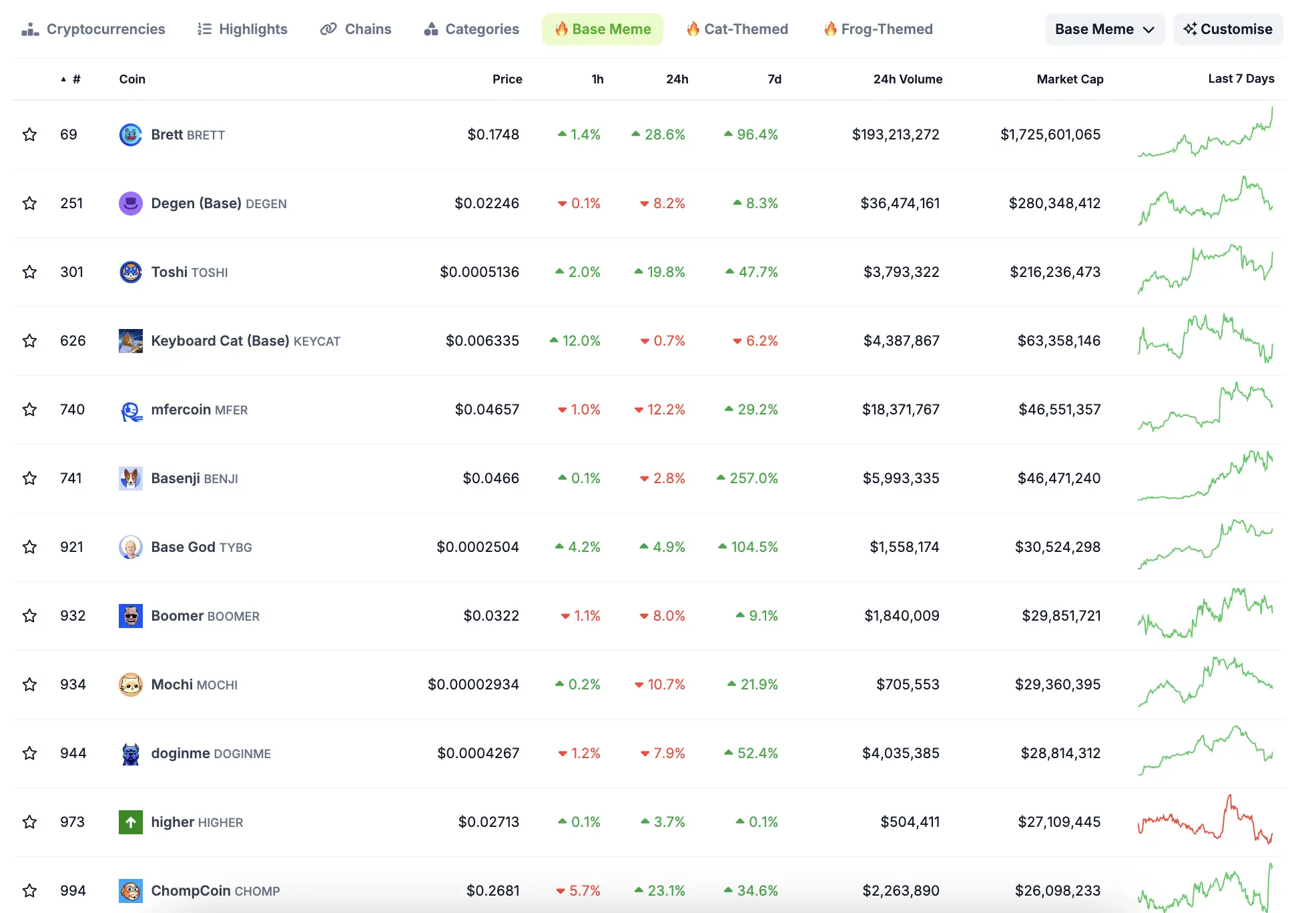其中BRETT以14亿美元市值稳居榜首,占据Pepe宇宙生态的核心位置。该项目巧妙借助Pepe青蛙的IP影响力,通过角色联动和社区共创,成功构建了完整的文化符号体系。其市值占比超过Base Meme币总市值的60%,展现出头部项目的虹吸效应。