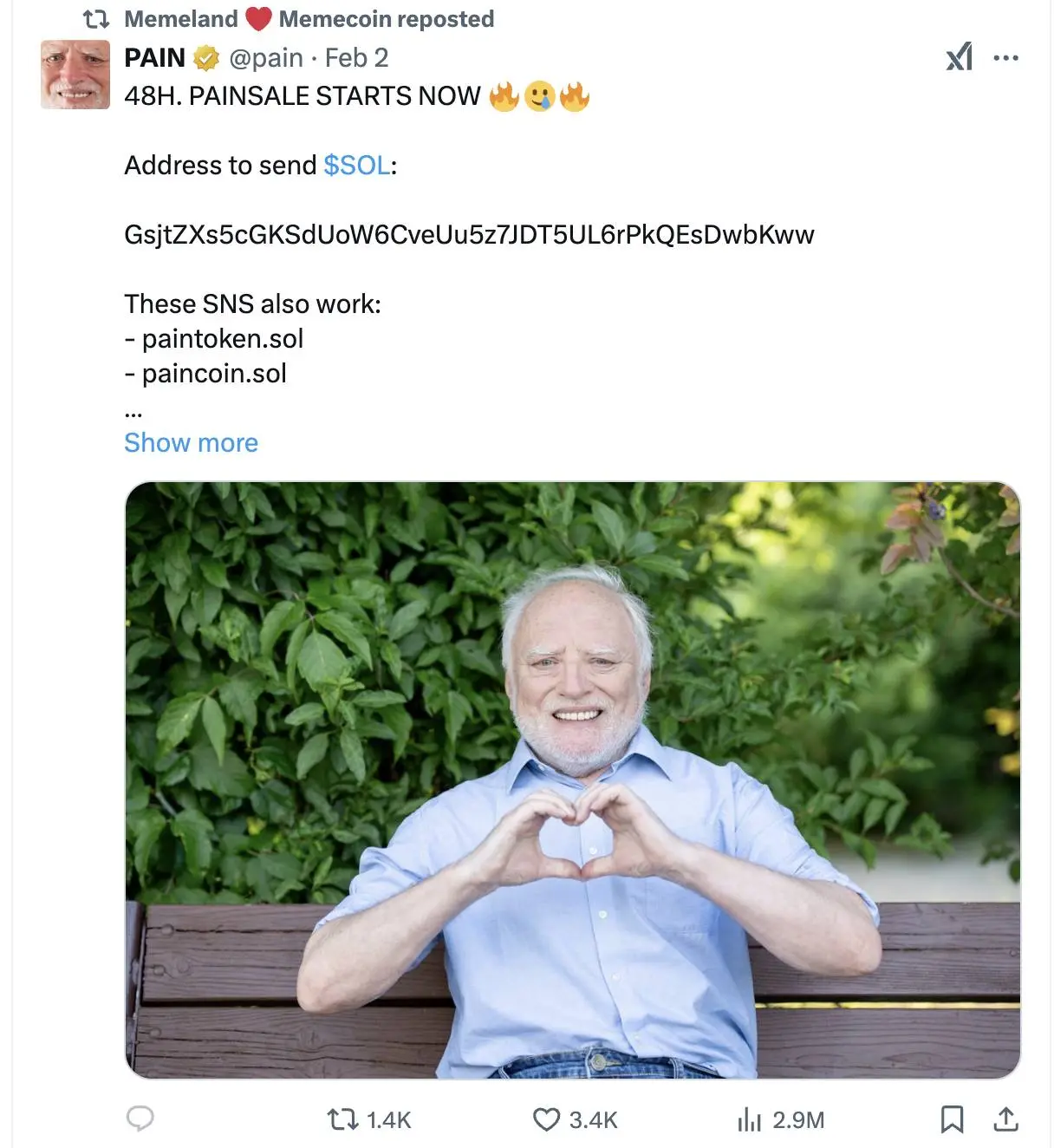 作为Memeland生态孵化的项目,PAIN获得了母平台的系统性支持。Memeland不仅开放其成熟的社交媒体矩阵为项目引流,更通过跨项目资源整合,将原有MEME代币持有者转化为潜在投资者。这种孵化器式的运作模式,显著降低了新项目的冷启动成本。