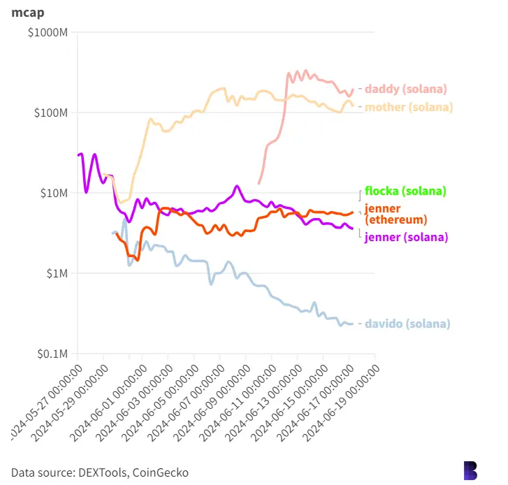 名人背书已成为Memecoin爆发的核心驱动力。以Iggy Azalea的MOTHER和Caitlyn Jenner的JENNER为例,这些代币在Solana和以太坊上的表现形成鲜明对比。