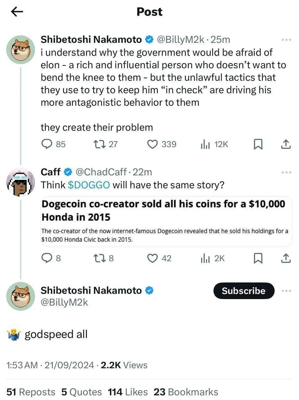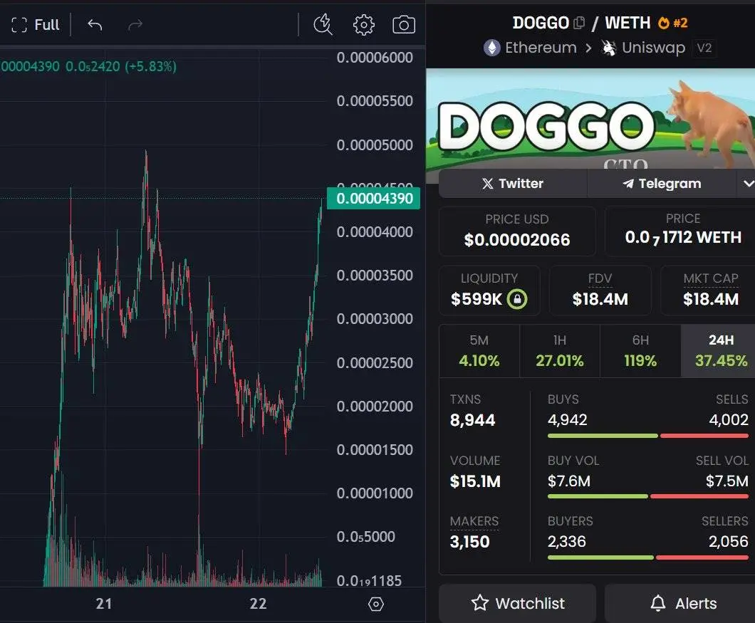 DOGGO项目方精心设计了一套OG叙事体系,通过将6.56%的代币直接转给狗狗币创始人,并刻意引导其后续的抛售行为,成功构建了一个”历史重演”的营销框架。这种手法巧妙利用了区块链行业对OG(元老级人物)的崇拜心理,通过制造”卖飞”的戏剧性情节,为项目赋予了看似合理的价值支撑。