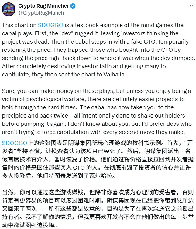 DOGGO的操盘过程展现了典型的四阶段洗盘模型:第一阶段通过OG叙事快速拉升市值;第二阶段配合利空消息深度砸盘,制造恐慌性抛售;第三阶段宣布社区接管(CTO)制造虚假希望;第四阶段再次深跌彻底击溃散户心理防线后暴力拉盘。